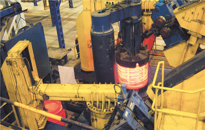 特殊鋼棒(卷)生產線是一條全連續式棒材和大盤卷復合熱軋生產線,加熱爐,連軋機,KOCKS減定尺徑軋機,飛剪,卷取樣,打包機等關鍵設備主要設備從法國斯坦因公司、意大利達涅利公司、德國kocks公司以及SIMENS及瑞典桑得斯公司引進。該生產線減定徑機組德國KOCKS軋機是世界上生產圓鋼尺寸精度極高的軋機,軋出的成品圓鋼精度等級能達到甚至高于1/4~1/5DlN1013標準,并且可以實現自由尺寸軋制,可實現熱機軋制工藝技術,全線的數字化控制和在線測徑技術、全線的控軋控冷技術、在線探傷技術。產品規格:?16mm~?90mm直條棒材和?14mm~?50mm大盤卷。直棒產品主要以軸承鋼、彈簧鋼、合結鋼、非調質鋼、碳素結構鋼、易切削鋼等產品為主。大盤卷產品主要以冷鐓鋼、優質碳素結構鋼、合金結構鋼、軸承鋼、易切削鋼、彈簧鋼等為主,是一條具有國內一流、國際領先水平的棒材、大盤卷復合生產線,產品具有內部組織均勻、表面質量好、尺寸精度高、產品品類全等特點。